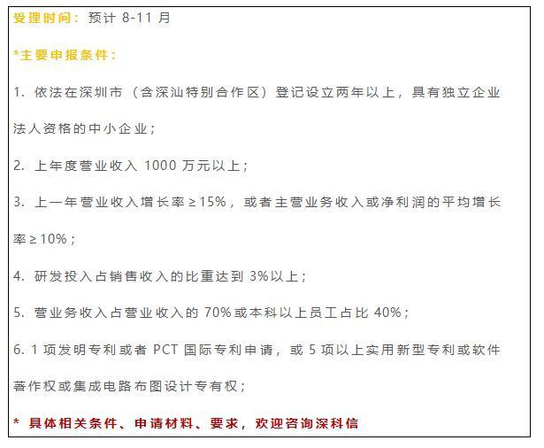 (7).本次预计申报时间为5月,企业一定要把握好时间,做好佐证材料收集、申报材料编撰及相关沟通工作事宜。不清楚的可以直接咨询深科信。
